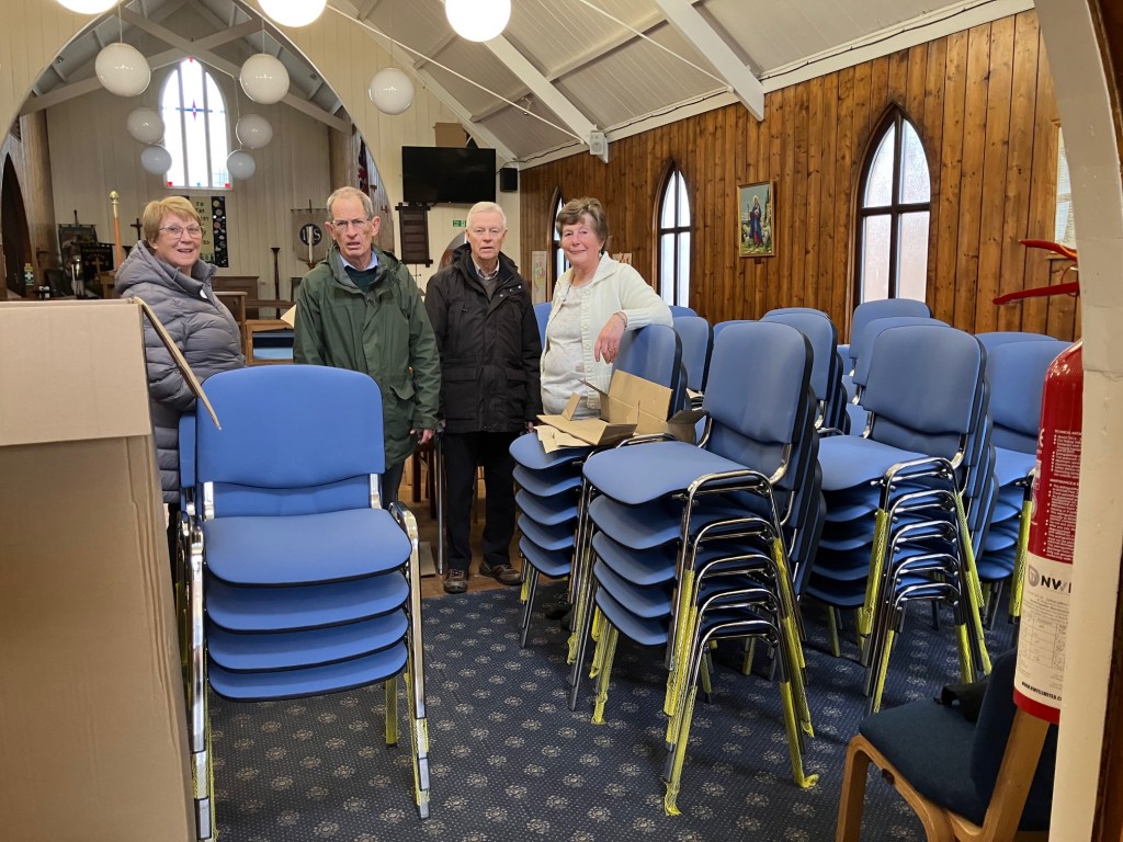 A big thank you to those who helped unload the new chairs and move them into the church – Sheila, Ian, Gaynor, Bill and Roger.