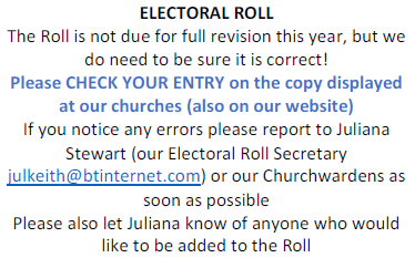 APCM and Electoral Roll 25/04/202625/04/2026rogerbracey Leave a comment (Please note the Electoral Roll has not been published on the website for GDPR reasons). Share this: Share on X (Opens in new window) X Share on Facebook (Opens in new window) Facebook Like Loading...