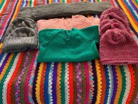 This week the first donation of completed items has been delivered to me – hats, scarves and mittens.