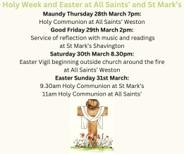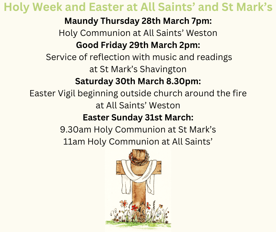 Holy Week and Easter at All Saints’ and St Mark’s Maundy Thursday 28th March 7pm Holy Communion at All Saints’ Weston Good Friday 29th March 2pm Service of reflection with music and readings at St Published 05/03/2024 at 940 × 788 in Welcome to our Website! ← Previous Next → Like Loading...