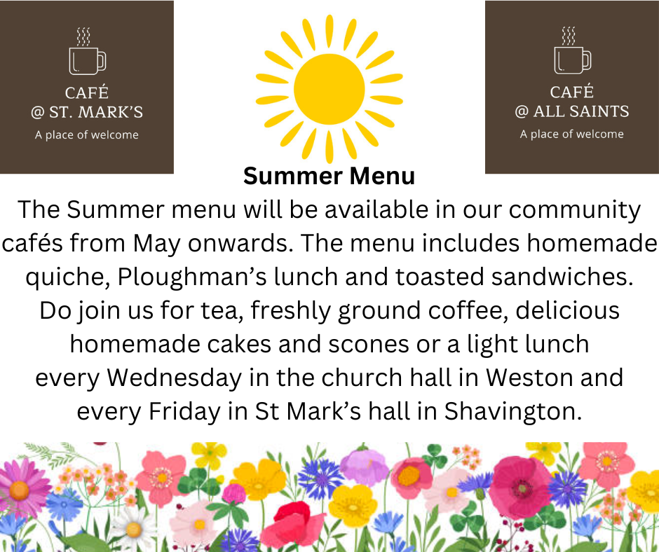 Summer Menu The Summer menu will be available in our community cafés from May onwards. The menu includes homemade quiche, Ploughman’s lunch and toasted sandwiches. Do join us for tea, freshly grou Published 25/04/2024 at 940 × 788 in Welcome to our Website! ← Previous Next → Like Loading...